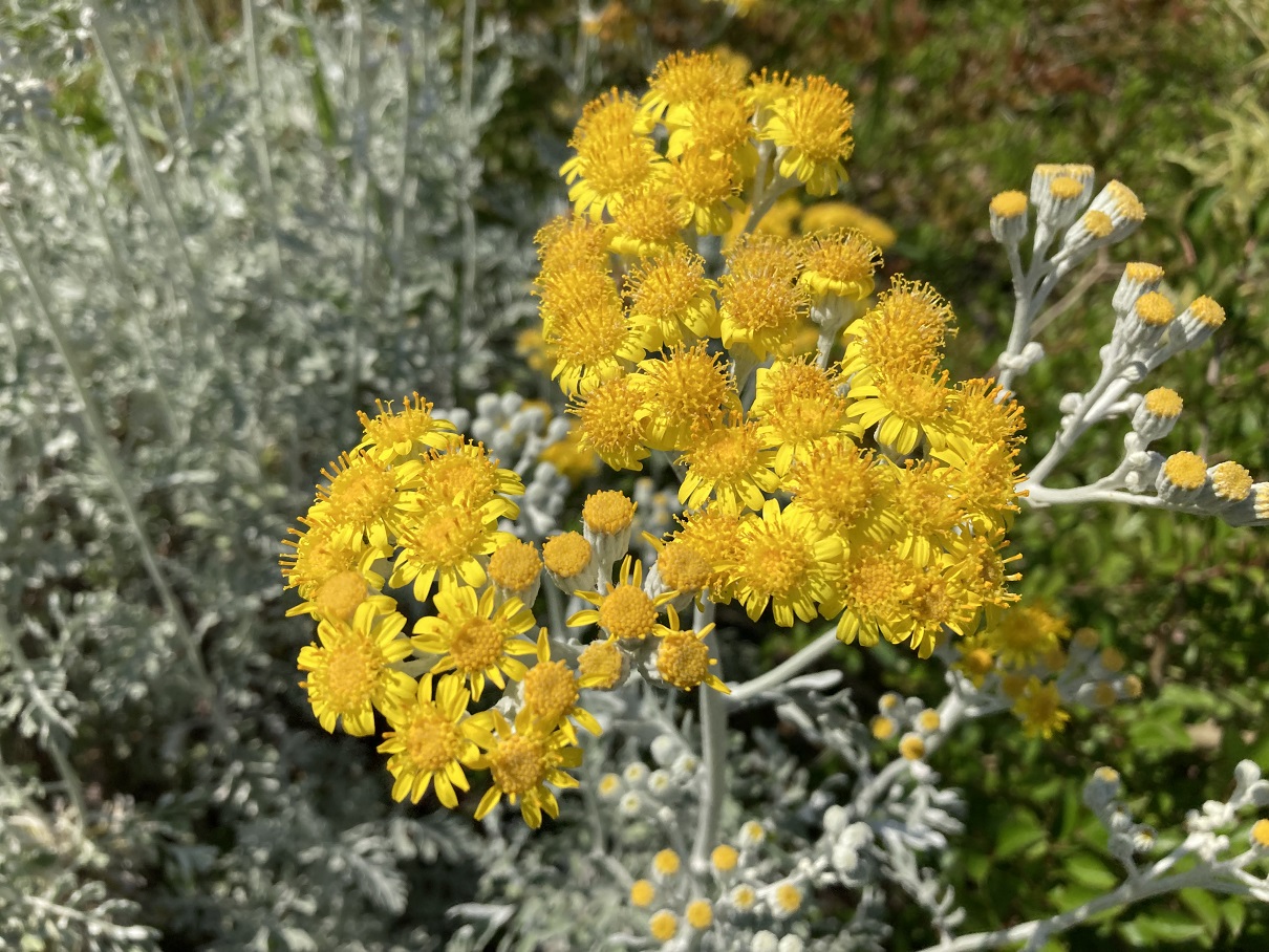 シンボルプロムナード公園 公式 シロタエギグ 地中海沿岸が原産でキク科の常緑多年草です 細かい白い毛が株全体に生えて銀色に見え 冬から春にかけて葉もの シルバーリーフ として寄せ植えに用いられています 葉には切れこみが入り 新芽ほど